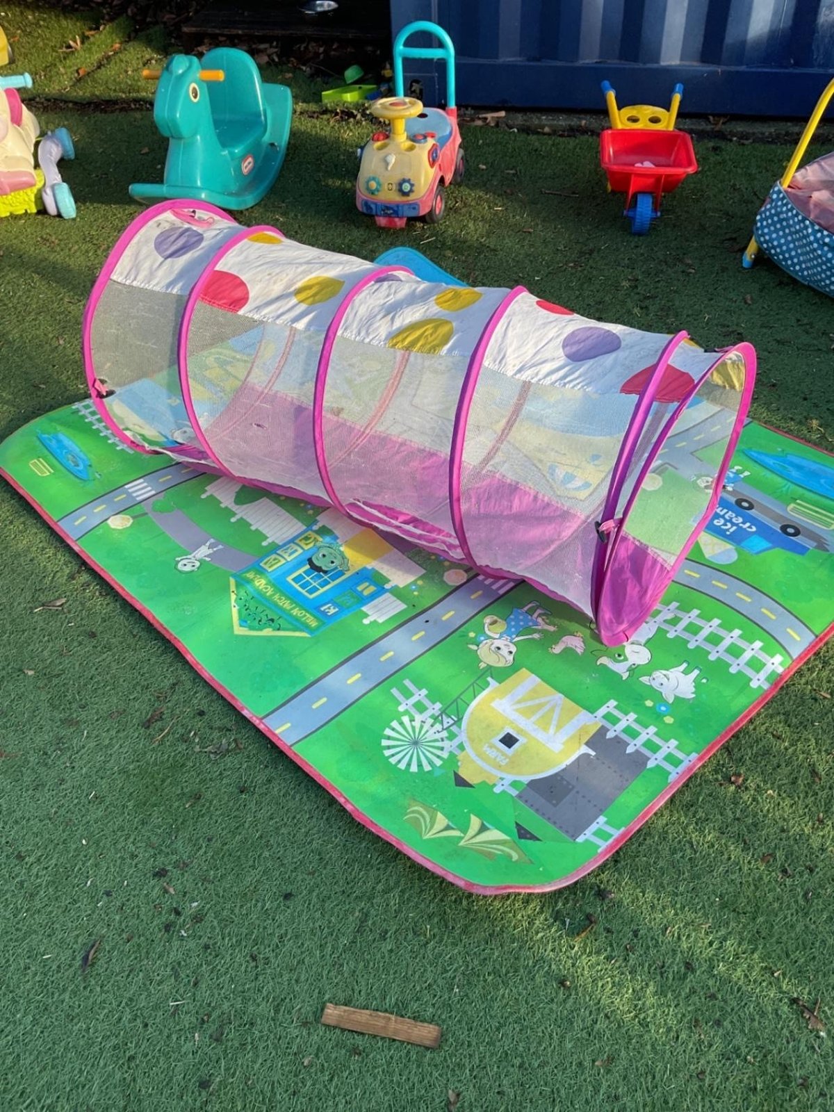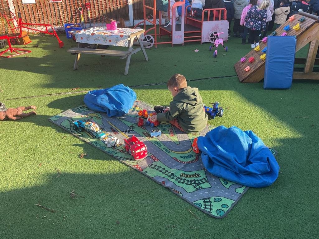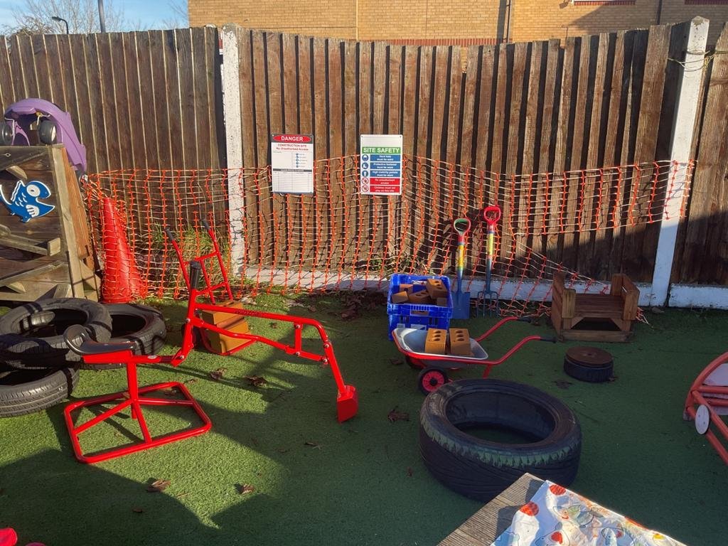 We incorporate real-life experiences into outdoor play, particularly within our construction area. Resources such as mini diggers, wheelbarrows, foam bricks, high-visibility jackets, and construction hats support imaginative play, problem-solving, and communication and language. Our outdoor mud kitchen further enhances creativity and role play, giving children opportunities to explore materials, textures, and cause and effect.