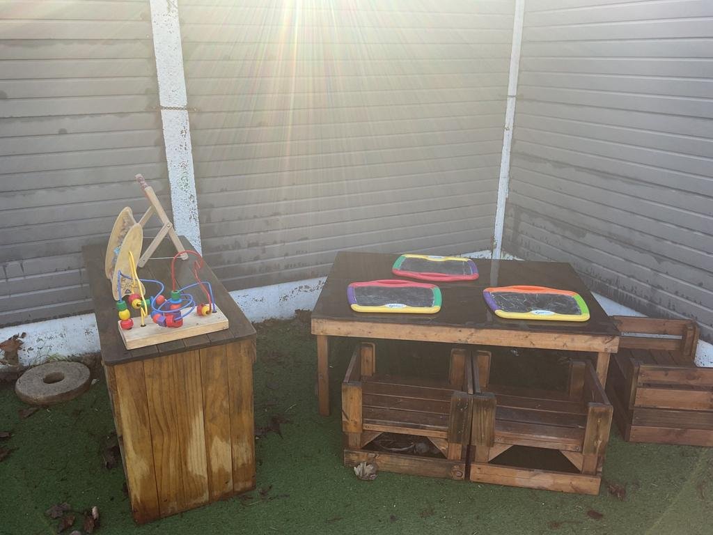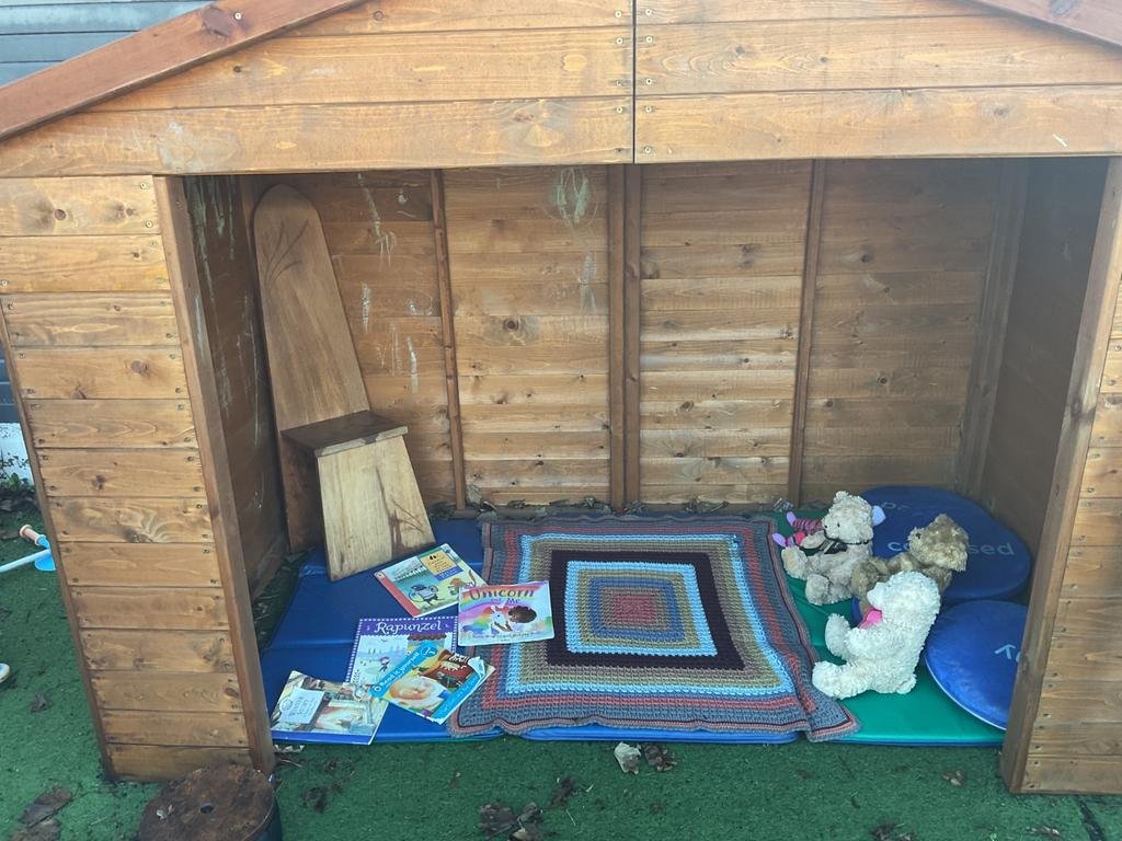 Our outdoor reading den provides a calm and inviting space where children can relax and enjoy books, supporting Literacy, listening skills, and a love of reading.
